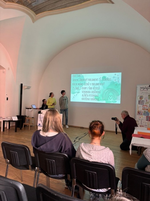 Naši práci v parlamentu skvěle odprezentovali David a Sára, kterým patří velké poděkování za jejich přípravu a vystoupení. Díky nim jsme mohli ostatním účastníkům přiblížit, jak funguje náš parlament a na čem aktuálně pracujeme.